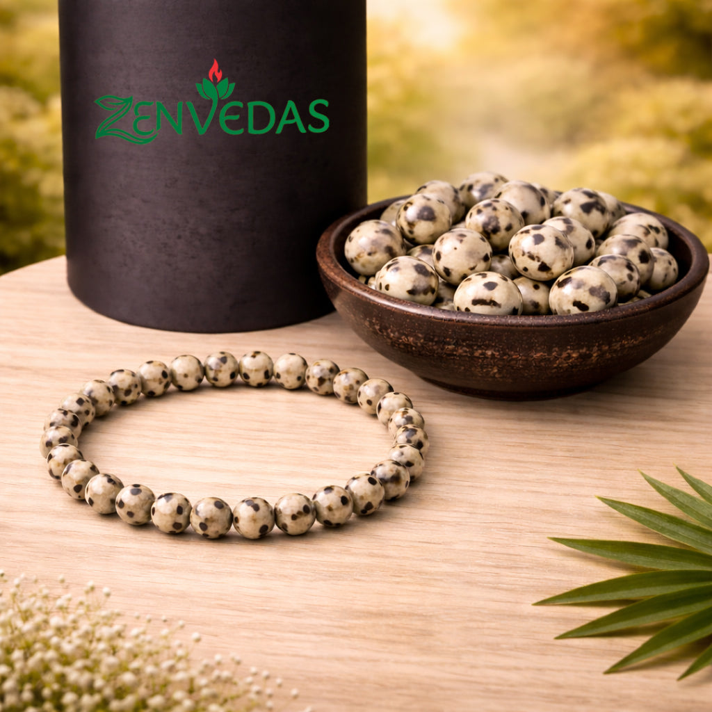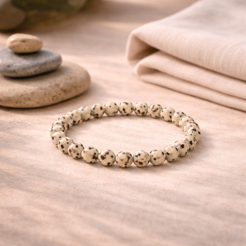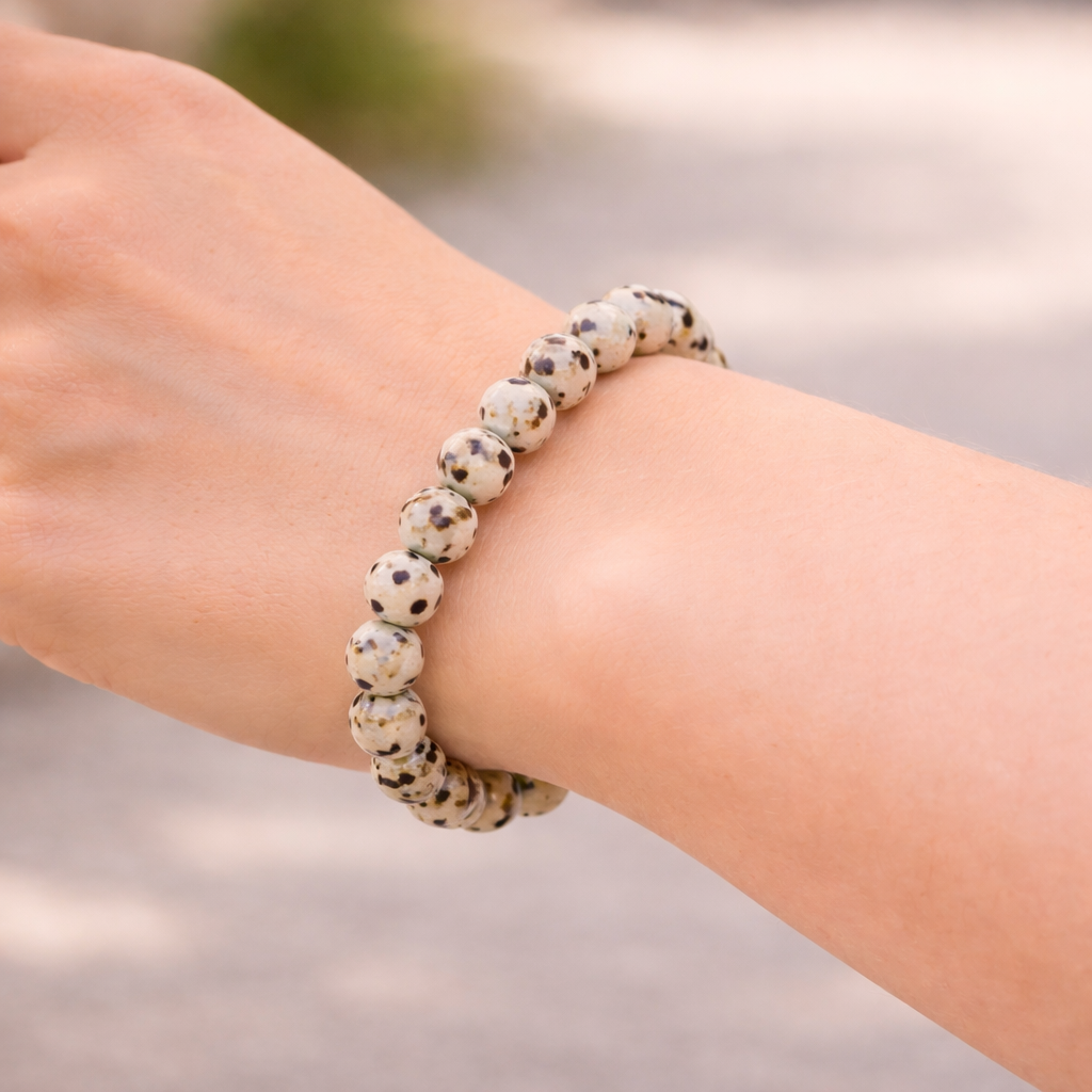 Elevate your spiritual journey with the powerful energy of the Dalmatian Jasper Bracelet, a timeless piece designed to align your spirit and enhance your inner strength. Crafted with smooth 8/10mm natural beads in Cream with black spots, this bracelet radiates refined elegance while supporting your energetic balance.