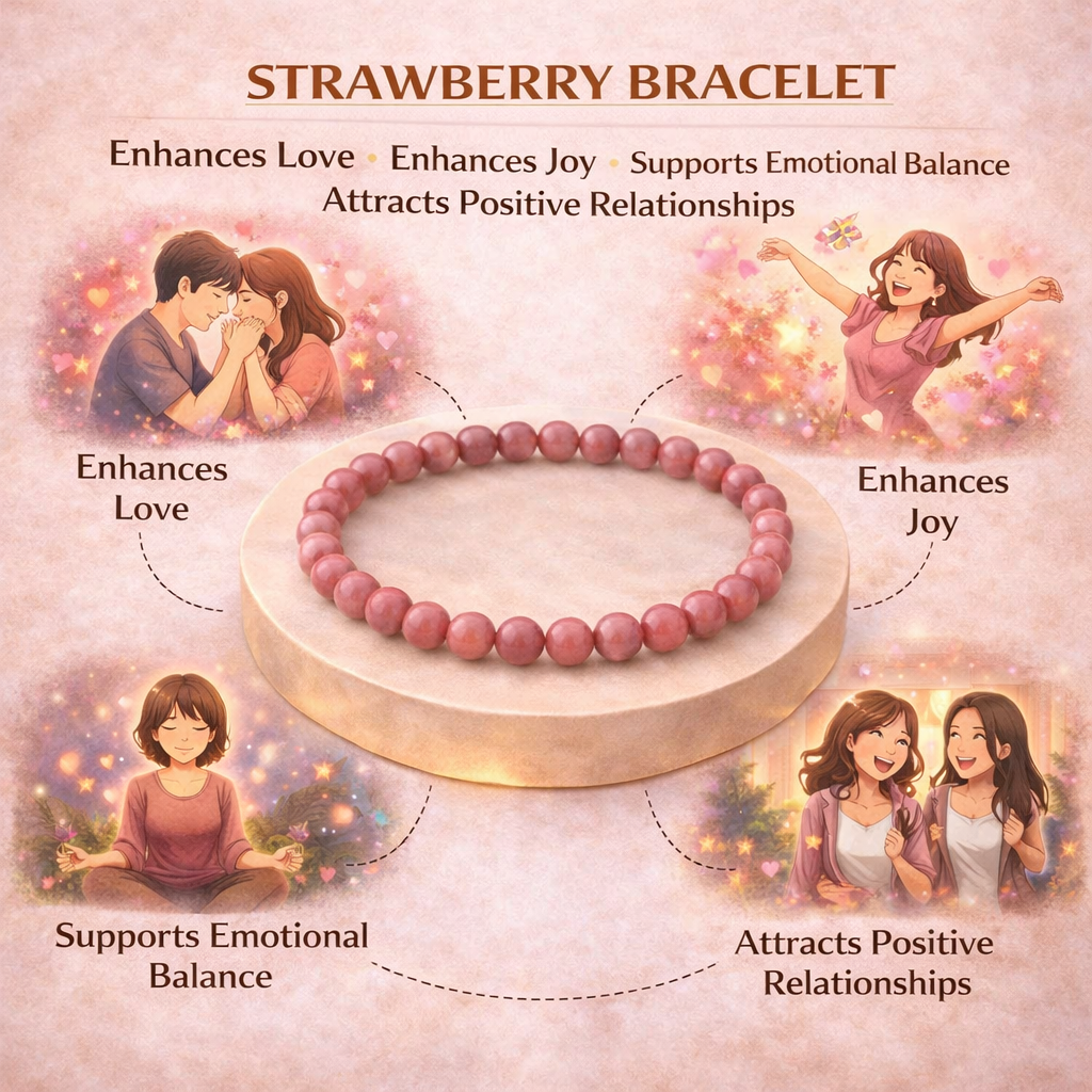 Wear the Strawberry Bracelet on your left wrist to receive its calming and protective energy, or on the right wrist to express its energy outwardly. It is suitable for daily wear.